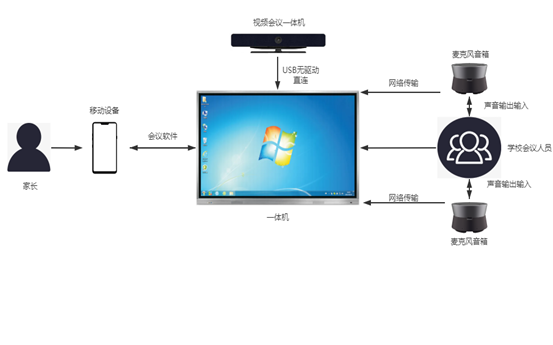 在線家長(zhǎng)會通過學校在會議室的電腦上安裝連接視頻會議一體機(C30R)、以(yǐ)及在會議室桌麵擺放多台級聯麥克風音箱(A20),家長通過使用(yòng)手機、平板(bǎn)或電腦結(jié)合會議軟件進行實時的線(xiàn)上家長會議(yì)。