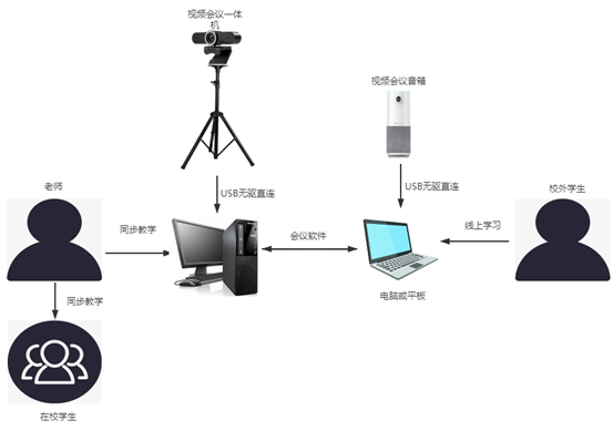 線上和線下同步教學通過老師在教室端給電腦連接上視頻會議一體機(8MP-U415AF),固定在(zài)支架上放置好(hǎo),不能(néng)返校的學生在家裏電腦端連接視頻會議音箱(C10),最後結(jié)合會議(yì)軟件進(jìn)行實時的線上和線下的同步教學。
